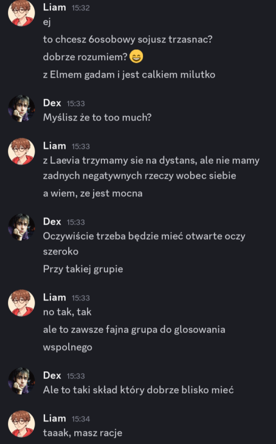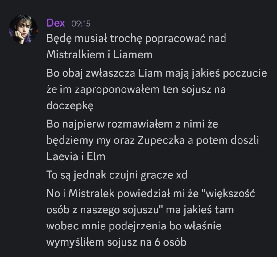 Dex wlasnie mnie pyta jak sie czuje z tym 6osobowym sojuszem i czy na pewno wierze w niego, bo on tak. XD no wierze, wierze, juz chuj z tym, ze jestem na dnie drabinki spolecznej tam, ale wierze, ze na razie to tylko odciagnie ode mnie target. Kocham Dexa robiącego damage control po tym jak Laevia napisala na zlym czacie ❤️ 😆