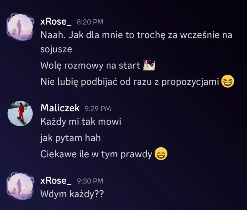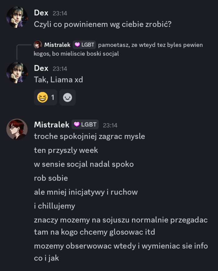 Well, liczę na to, że zrobimy sobie chwilę szczerości i opowiemy sobie kto z kim jaki ma vibe. Ma to na celu lepsze zrozumienie który z nas potencjalnie z kim może trzymać, a z kim w ogóle nie mamy relacji (potencjalne zagrożenia w przyszłości). Plus no, chcę się z nim potestować, bo mamy taki vibe, że głowa mała i jak nam kliknie, to ja jestem gotów z nim mocno mieszać w tej grze. :CatBlush: