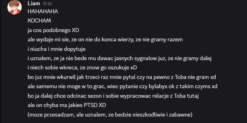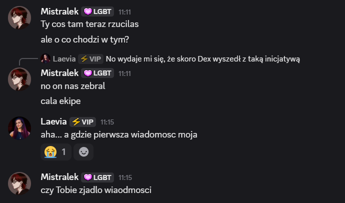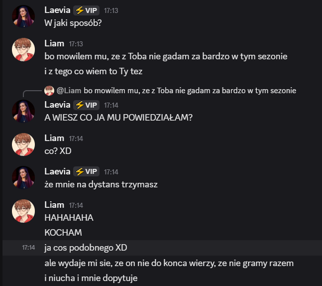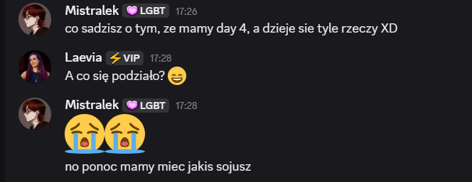 no i długo nie trzeba było czekać, już Liam mi napisał, że Mistralek się zaniepokoił flopnieciem Laevii i doskonale wie, że jebla się z kanałami sojuszowymi XD oj chyba będę musiał szukać innych szalup ratunkowych :kim: