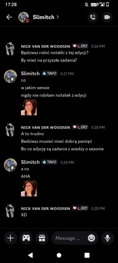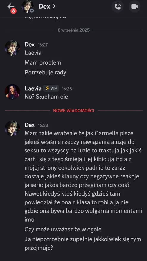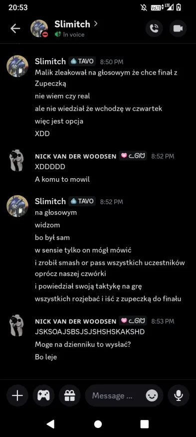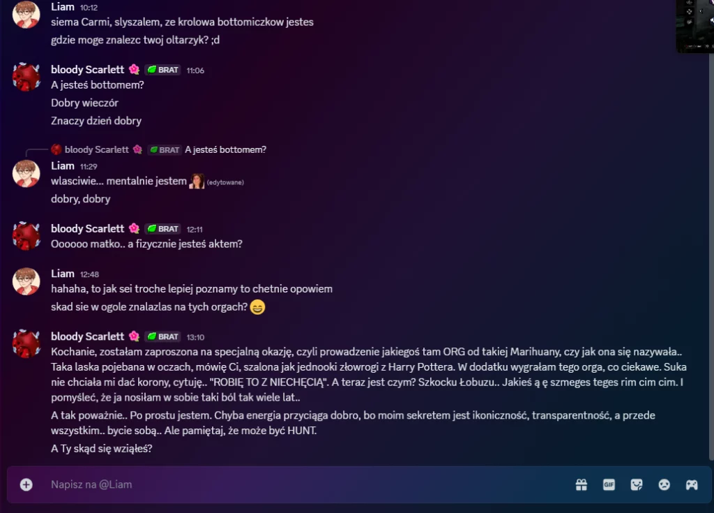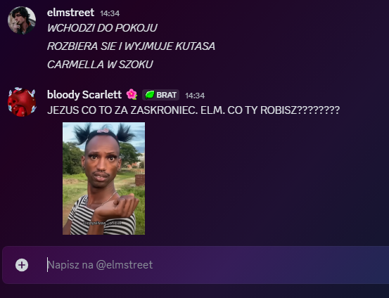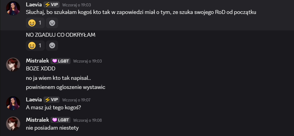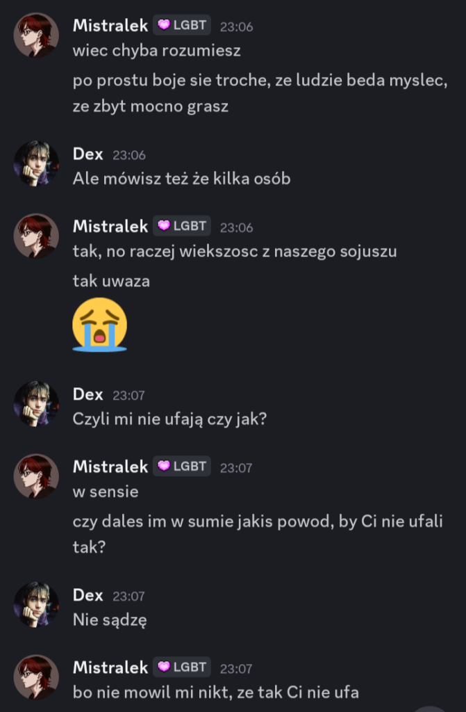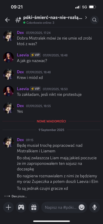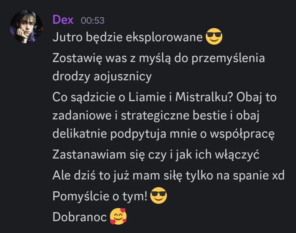 Kocham to, że Laevia się pierdolnęła i zamiast na czteroosobowym sojuszu (z Dexem, Elmem i Zupeczka) napisała na sześcioosobowym, że „spróbuje ich delikatnie podpytać”. Teraz próbuje wybrnąć, że „ich” to Psycha i Jake, a nie Mistralek i ja XDDD. kocham, że nie jestem pierwszą osobą, która napisała coś na złym czacie. XDDD hahaha, sikam. Laevia, dzieki ❤️