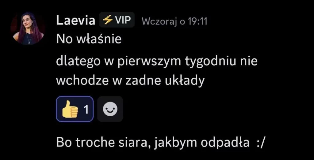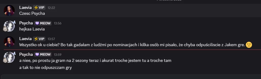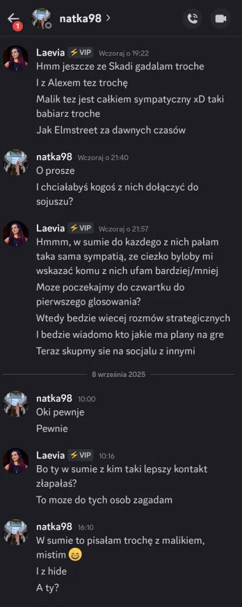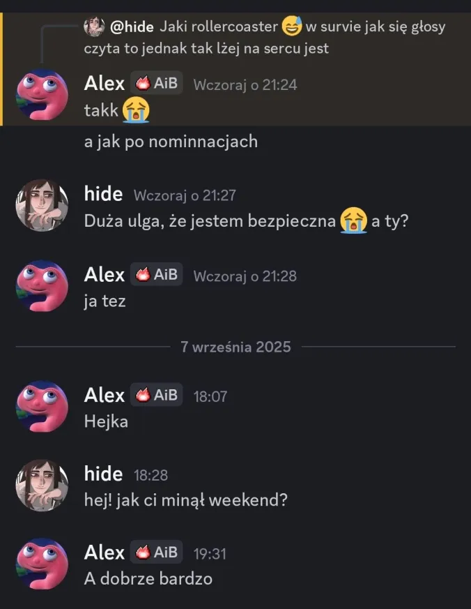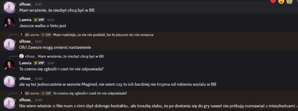 z zabawnych rzeczy – rozmowa sprzed nominacji: kocham jak Laevia sama sobie wkrecila, ze wiem cos o targecie na nia, bo moja jedyna reakcja na jej wiadomosc bylo serduszko, a nie zapewnienie, ze jest safe. XD ale kocham (serio, serio, bez grama ironii), ze tak pieknie oddzielilismy sobie poprzednie sezony i gadamy tak jakbysmy dopiero sie poznawali. krolowa 👑