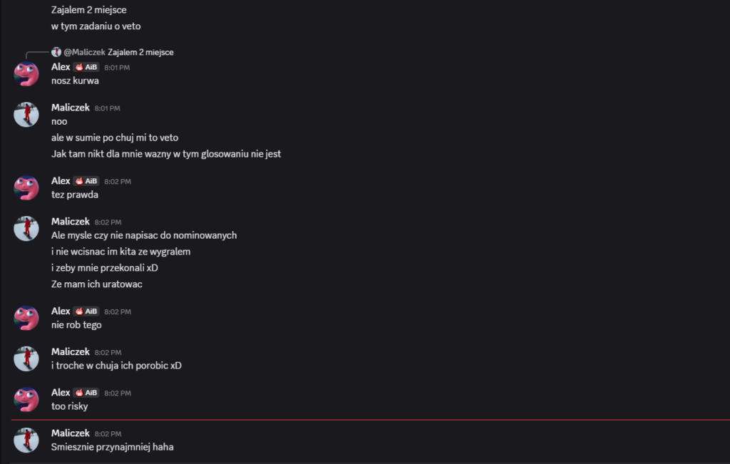 Gadam obecnie z Psychą i Jake’m żeby zobaczyć na kogo z nich fajniej zagłosować. I mean jeszcze veto przed nami, ale socjal jest ważny. Oni chyba będą narzekać na Zupeczkę, bo obojgu napisała, że trzyma kciuki XDD Co do oceny, Psycha mi wprost powiedziała z kim pisała i z kim najlepiej się trzyma, także zaplusowała. Jake taki niechętny, byleby info wyżulić. Niby ze Skadi coś gada, ale czy mu ufam? XDDD Także Psycha>Jake
