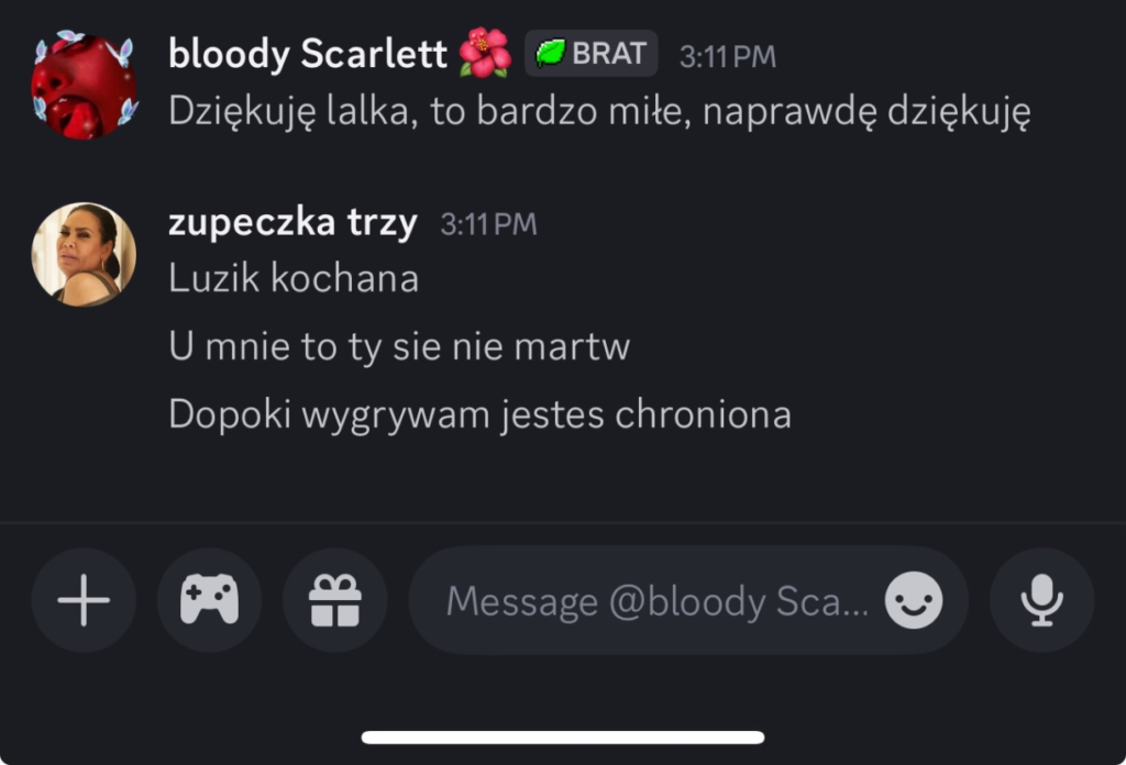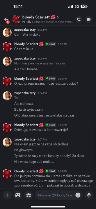 Skadi: Ja mam najgorszy kontakt z Carmellą i myśle że jakbym wygrała to nominowałabym ją z kimś, bo przez ostatni tydzień nie odezwała się do mnie ani słowem a wulgarne piosenki jakoś ma czas wysyłać 😆