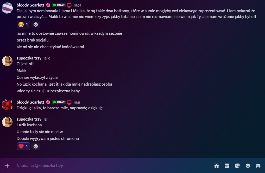 Zupeczka: Nominuję Edana i Chanel. Lud został zapytany i się wypowiedział. Można by powiedzieć, że wybór ten nie jest ani oczywisty ani kontrowersyjny, jednak jest tak ponieważ pragnę, aby w naszym domu wszyscy czuli się wysłuchani. Kochani, kochajmy się, słuchajmy, szanujmy. Live, laugh, love 💕 Pozdrawiam brata. Nie pozdrawiam prowadzących.