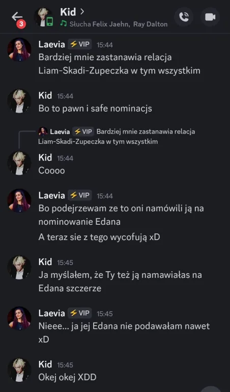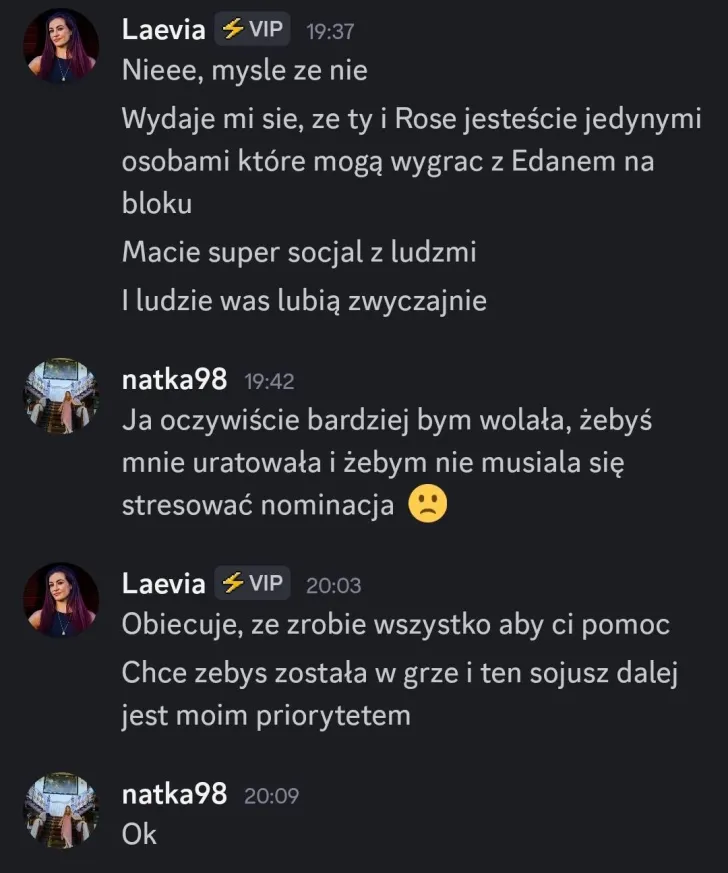 Meciek Willis: W ostatnich dniach wydawało się, że miałaś dobre relacje z Edanem, bo połączyło was to, że Zupeczka was nominowała. Czy gdybyś została uratowana przez Laevię to wstawiłabyś się za nim, czy może nie miało to większego znaczenia?