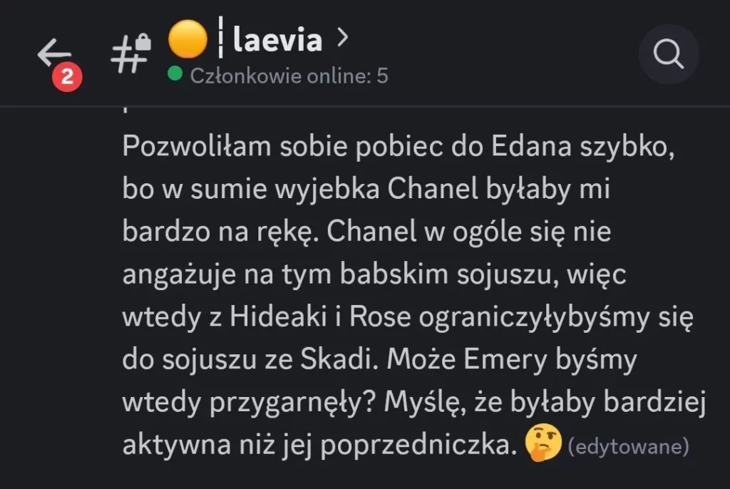 Skadi: Ja myśle że Laevi się z jakiegoś powodu ten pomysł nie spodobał bo np poczuła się zmanipulowana przez Zupeczke lub coś w tym stylu albo ona nie chce ratować Chanel?