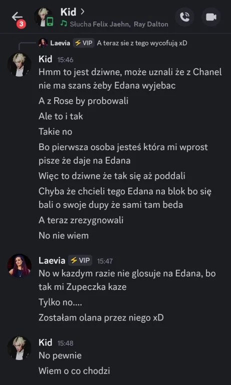 Edan: Malik chyba też leci na hajs jak ja. Bo Alex, jak i sam Malik mi powiedzieli, że na mnie ten idiota da, bo chce pieniądze.