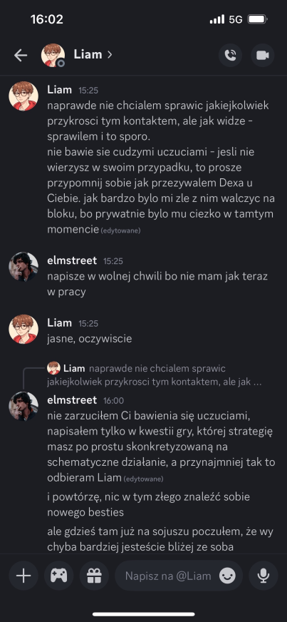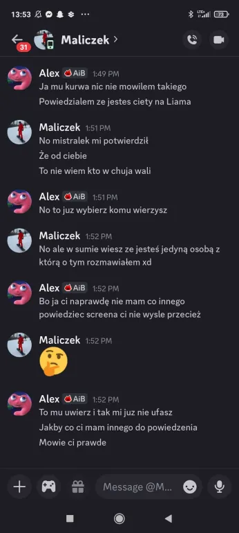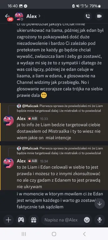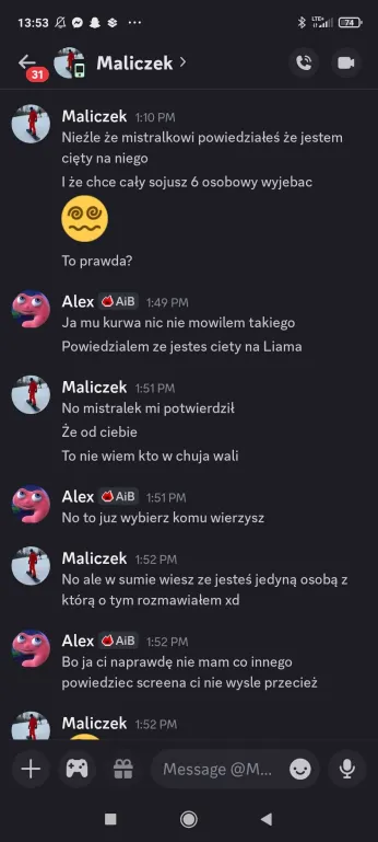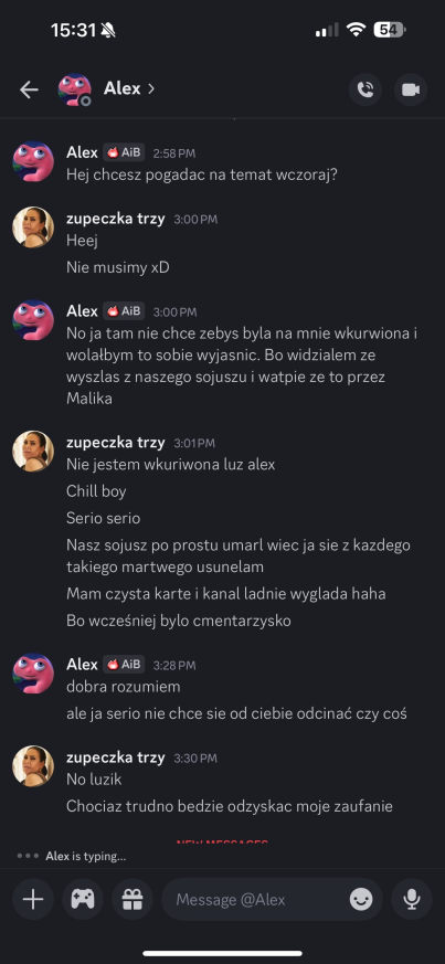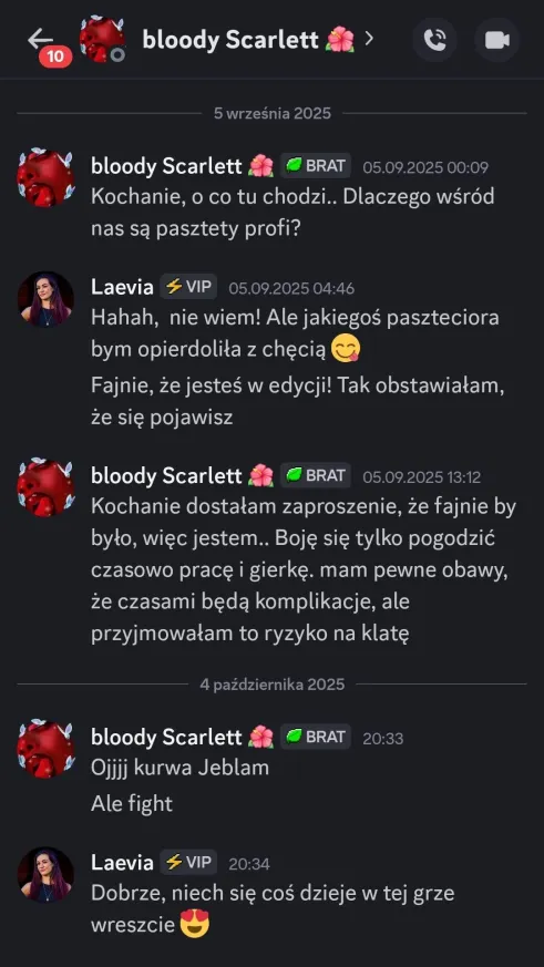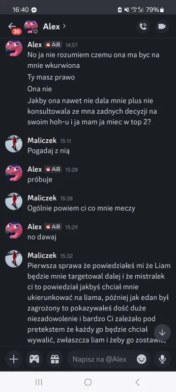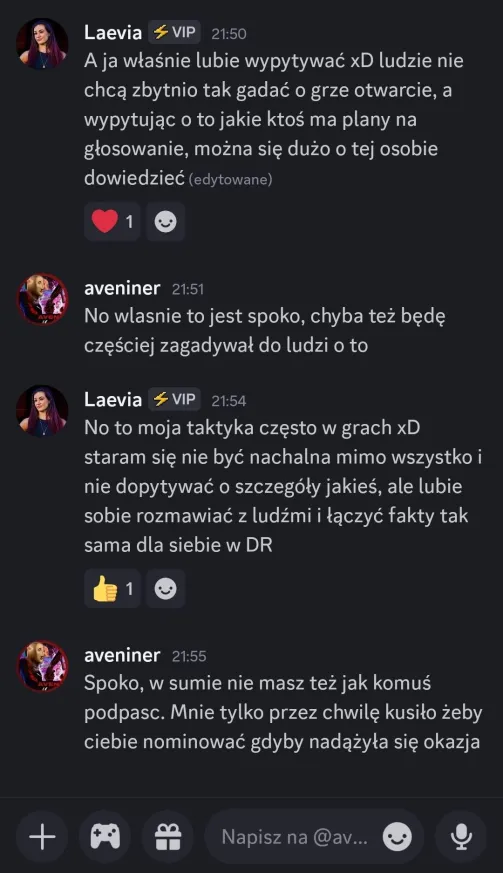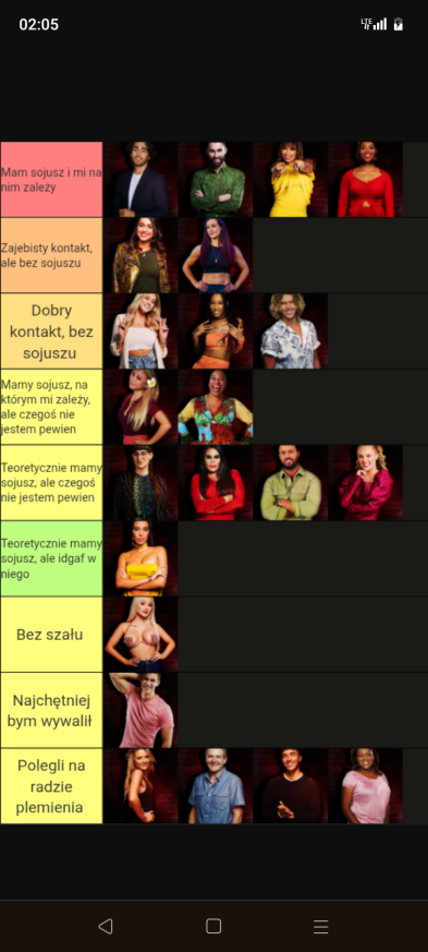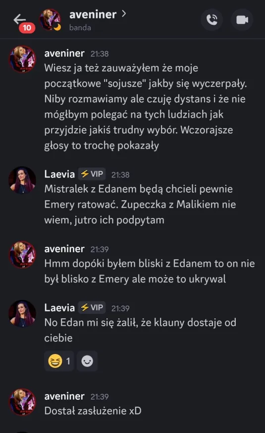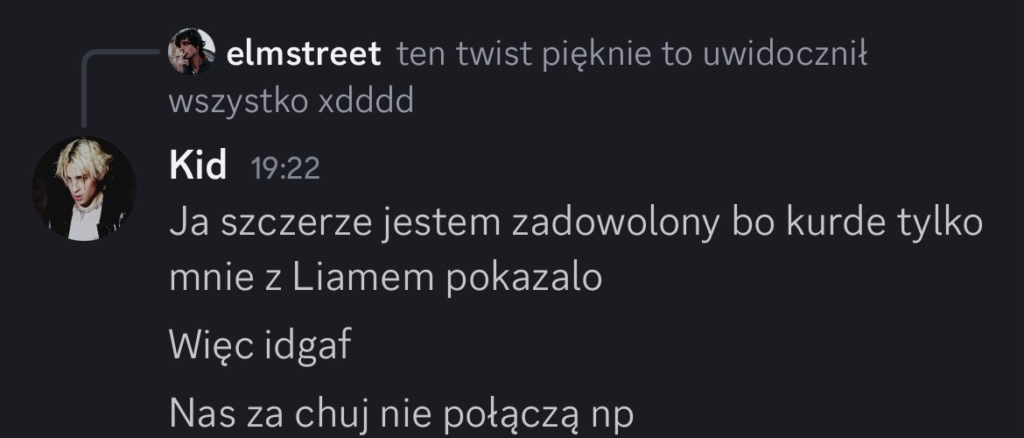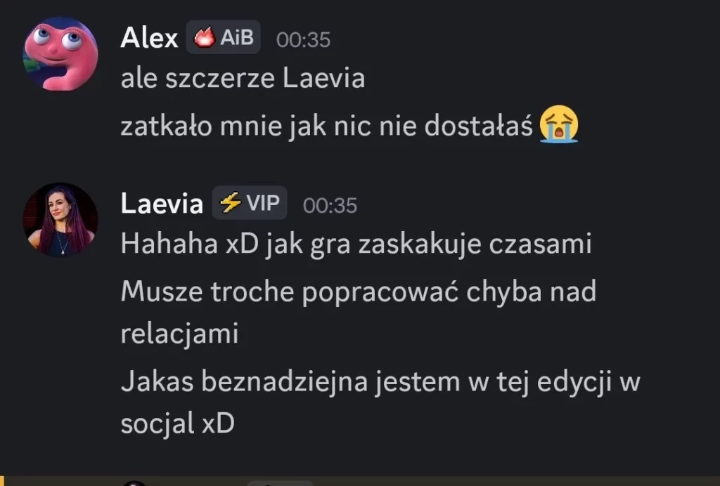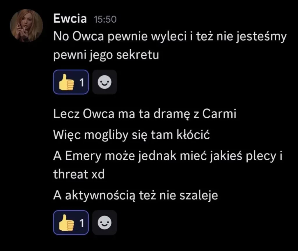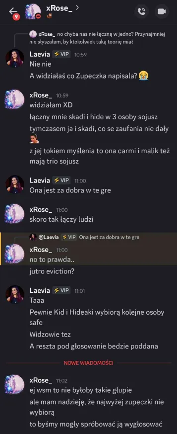 Sabotaż dla mnie oceniam git, chociaż Elm nie dostanie kolejnego meltdownu, a ja z głosem byłem okej. Edan też docenił, bo wie jak ja jestem łasy na hajs, a nie ojebałem go Co do rankingu, to ja w szoku, bo Alex do mnie, że jak myśli, ile spadniemy po tym weeku XDD No na pewno bardziej widocznie zagraliśmy, ale wszystko co chcieliśmy udało się jakkolwiek osiągnąć Alex też stwierdził, że ja i on to lustrzane odbicia. Mamy podobne gry pod wieloma względami, tylko inni ludzie są jako patterny. W sumie zgodziłem się z tym, oprócz tego, że ja jestem bardziej widoczny i miałem jakieś akcje w week 1Z Alexem mi się świetnie współpracuje, bo nie jesteśmy w ogóle od siebie zależni. Mamy inne siatki sojuszy, różne relacje z ludźmi i w ogóle. On ma lepsze kontakty np. z Zupeczką i Malikiem, ja z Liamem i Elmem. Więc nawet jak komuś coś umyka, to najwyżej można się wspomóc Przegadaliśmy też jego „showmance” z Edanem i widzę, że Alex patrzy logicznie i nie będzie się przyklejać do kogoś na całą grę, bomba Dzisiaj pewnie przegadam coś z sojusznikami jak się zapatrują na ten week. Rose już mówi, że trzeba wyjebać Liama i Liam, Liam i Liam Ja nie wiem na czym będzie polegał ten format weeku, ale jak nadarzy się okazja cutnąć Laevię, to w to idę. Ale no zobaczymy czy w ogóle będzie taka możliwość
