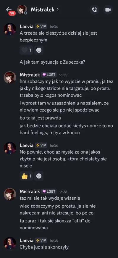 Aven: moze tak byc ze ktokolwiek wygrywa zadanie/jest wyzanczony przez hostów daje jeden nick ktory lubi i jeden ktorego nie lubi