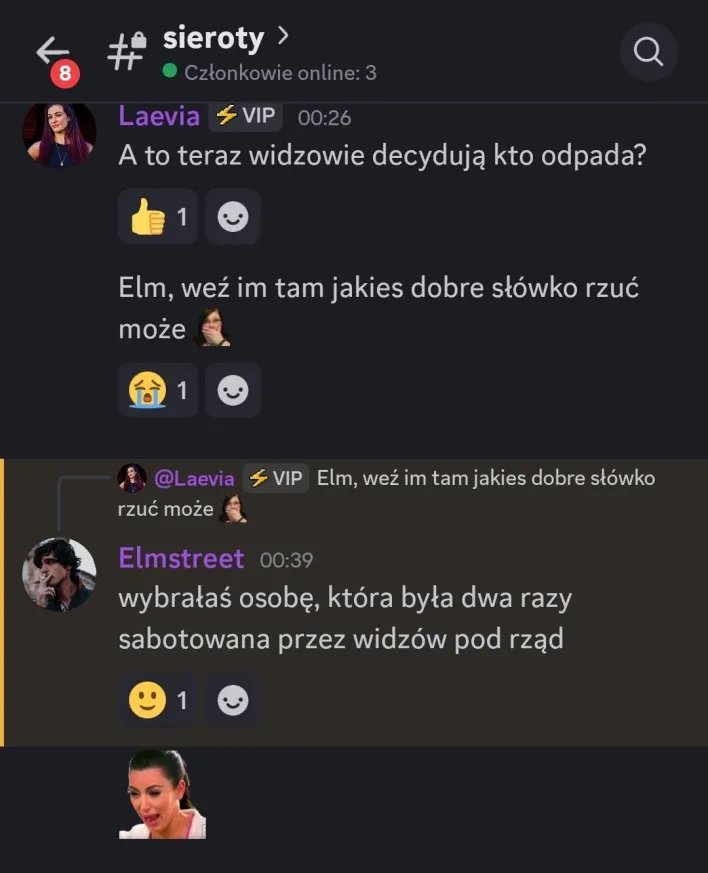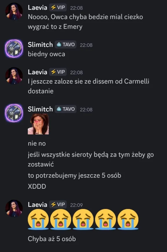 Slimitch: Żegnaj, Owca Niestety, spodziewałam się, że to się stanie. Ludzie uważali cię za AFKa 😭 powinieneś być bardziej aktywny przez cały twój udział… Niestety, zgubił cię durny twist który uratował Malika przed byciem na bloku :wyje: Chciałam z tobą pograć i wgl przykro mi że odpadasz i mam nadzieję że jeszcze kiedyś spotkamy się w jakimś sezonie i rozwalimy konkurencję 😼 a teraz papapapa :bye:
