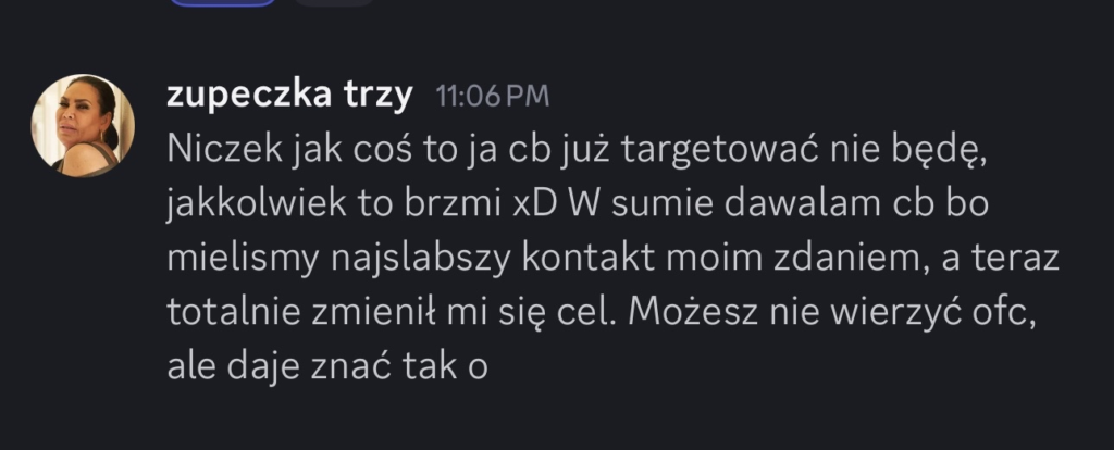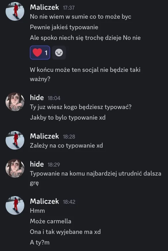 Zastanawiam się właśnie :wyje: Na ten moment nie ma osoby z którą żyłbym jakoś bardzo źle więc trzeba wybierać strategicznie i wbić kosę w plecy tym którzy będą zagrożeniem po blackweeku