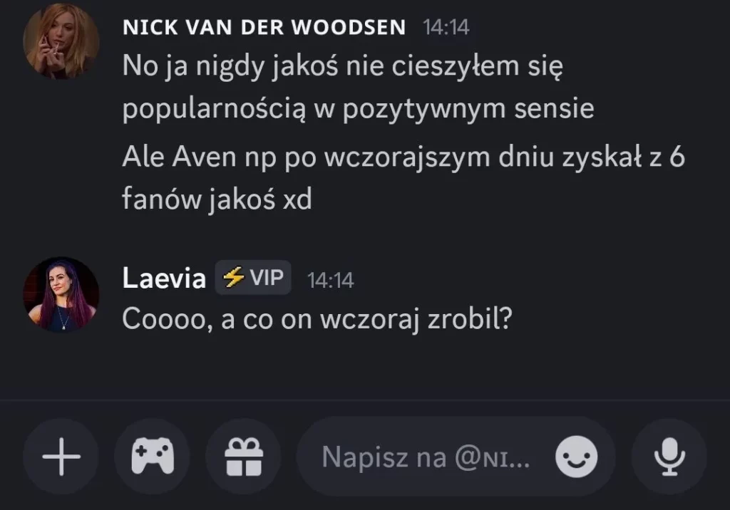 Owca: To tutaj widzę kłamstwo, bo probowałem rozmawiać z każdym, ale niektorzy odpisywali mi po kilku dniach albo po spamie wiadomości, m.i.n Malik czy Carmella, ale widze, ze wiekszosc tych graczy, ktorzy maja uznanie przez inne edytcje mysla ze bedzie sie im klaniac