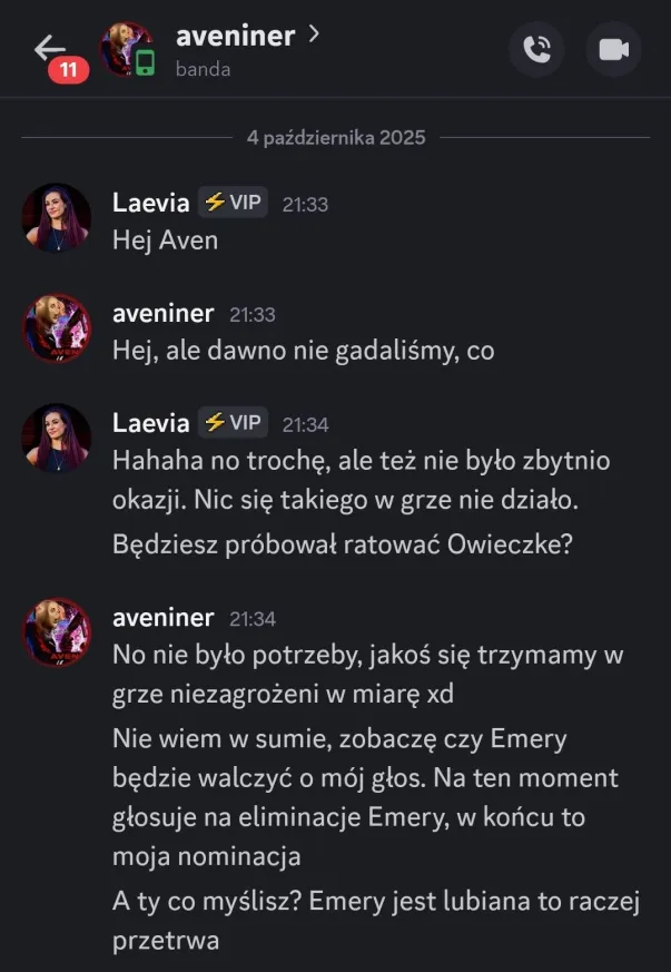 Aven: „prosimy, aby każdy z was przemyślał z kim wiąże swoją przyszłość w grze oraz czyja obecność w domu Wielkiego Brata blokuje waszą drogę do wygranej”