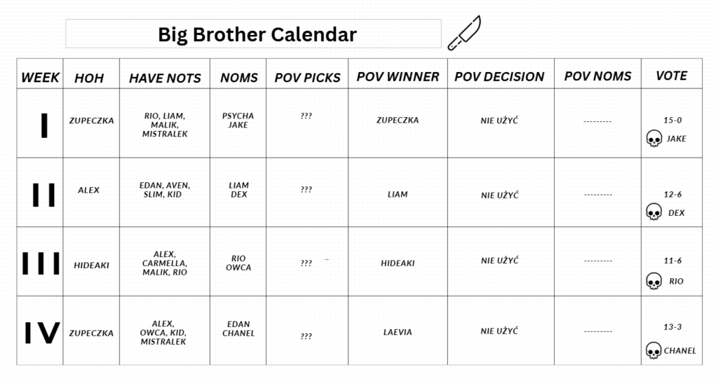 Fajnie się potoczyła ta eksmisja, w sensie myślałem, że będą bardziej wyrównane te głosy, a w sumie wszędzie nawet na moich sojuszach widziałem tylko „na Chanel, na Chanel” więc było lekko. Tho to był ostatni dzień w którym było lekko patrząc na to co teraz ma się dziać… Blackmail week. Patrząc na to, że mieliśmy 4 osoby rezerwowe wskazać do safe house, to pewnie tyle w tym tygodniu odpadnie. Ja nie ukrywam, że jestem trochę osrany, w sensie żeby nagle mnie nie wzięli za jakiegoś targeta i nie wywalili jak będzie okazja, liczę że jeszcze sojusze przetrwają tą próbę i jakoś uda mi się przez to przebrnąć, bo patrząc na to jak dużo osob ma odpaść to etap jury już niedługo i tym razem chce do niego dojsc