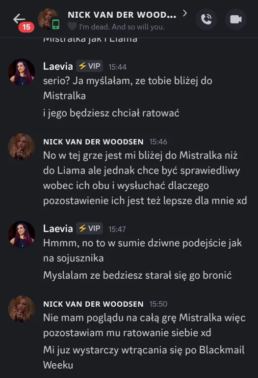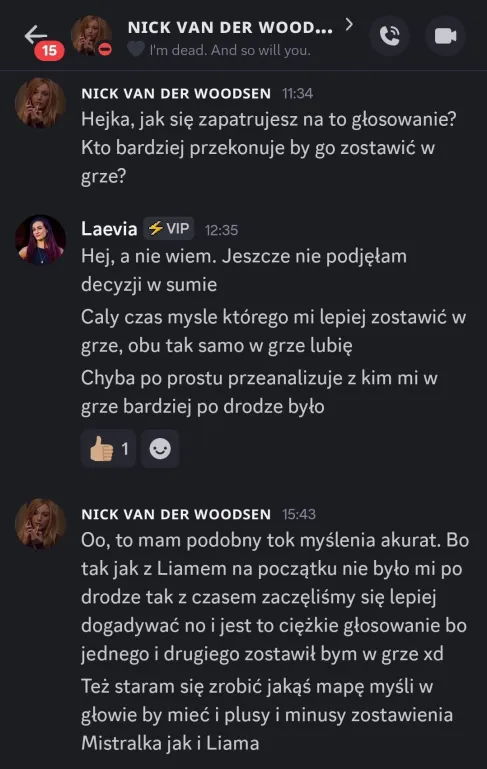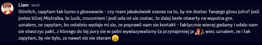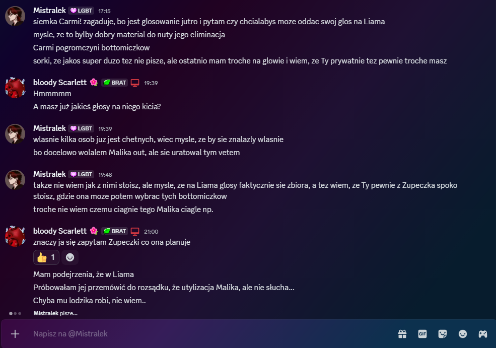 Wow, Liam pierwszy raz od nominacji zagadał do mnie o głosowanie, rychło w czas XDDD Tbh po wczoraj mam coraz mniejszą ochotę na głosowanie przeciwko Mistralkowi