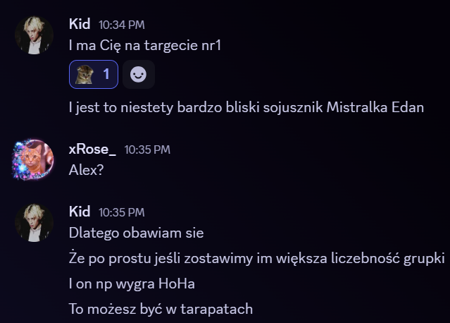 Emery u mnie jest bardzo wspierająca, ale ona może tak u obu, muszę jutro więcej czasu poświęcić jej, żeby faktycznie na mnie nie dawała Rose mi mówiła, że się waha wczoraj, dzisiaj jest bardziej za Liamem niby u Alexa, ale każdy wie, że ja z Alexem gram, więc mu można każde gówno wcisnąć Kid ma się przespać z tym wszystkim. On jest RoD z Liamem, ale no głos to głos, do każdego przyjdę gadać Pozytywnie patrząc, Alex, Slim, Edan, Emery i Rose to 5. Jak Zupeczka użyje swojej przewagi, to potrzebuje 8, a 8 to już w chuj głosów XDD Najlepiej ogarnąć Skadi, Hideaki i Laevię, ale kurde nie wiem czy to możliwe nawet. Rose musiałaby być bardzo przekonana na tego Liama i to pushować. Będę kminić