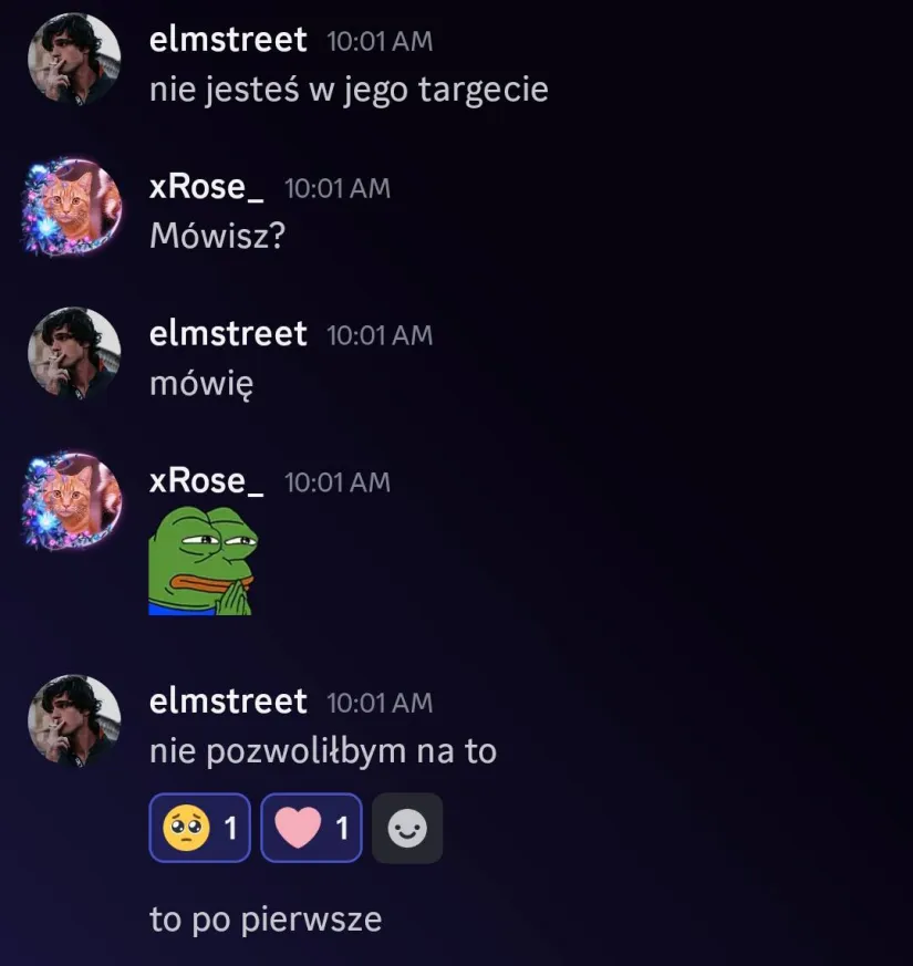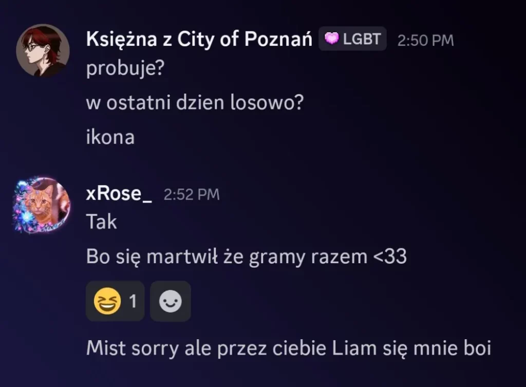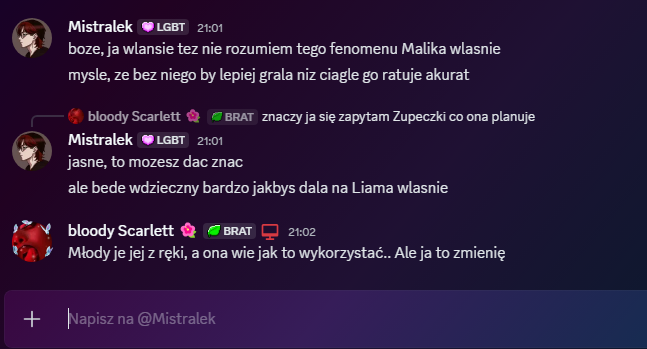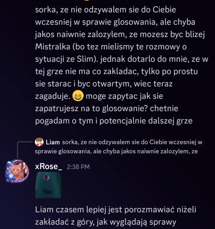 Rose: Mistralek – Starałeś się uratować sytuację i myślę, że wiele osób to w jakiś sposób doceni. Chciałeś dobrze, a twoje argumenty też wcale nie były złe. Ja niestety niewiele mogłam w tej kwestii zrobić.. nie decyduję za innych. Dziękuję ci bardzo za wspólną grę 🥺 Mimo niektórych sytuacji uważam, że była to naprawdę ciekawa rozgrywka. Może uda się następnym razem? Trzymaj się, Mist 🩷