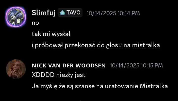 Slimitch: Żegnaj, Mistralek Nie spodziewałam się, że kiedykolwiek wypowiem (czy też jak w tym przypadku napiszę) te słowa. Stało, się, odpadłeś przede mną w (w praktyce) pierwszej edycji, w której cię nie targetuję… Dziękuję za wspólną grę (nie tylko w Valorant i IDV) w BB i szkoda, że tak się dzieje, bo z tobą miałam zdecydowanie najlepszy kontakt ze wszystkich uczestników i przykre, że nie wykonałeś swojego celu dotarcia do jury 😭 Mam nadzieję że to cię nie hitnie aż tak bardzo i że będziesz żył, w końcu jesteś slaytralek i strongtralek Papapapapa :bye:
