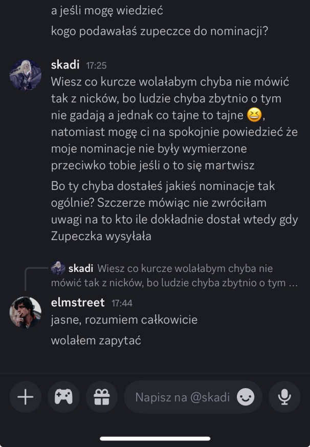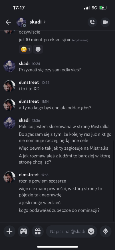Skadi: Elm tłumaczy mi, że jest wolnym strzelcem, nie wierzę w to zbytnio. Wiem, że on się boi że dam gonna nominacje, nie bez powodu wysyłał mi pieniądze 😆,