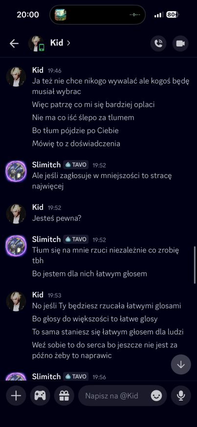 No i ciężko będzie, dopiero co Slim przekonałem żeby na mnie nie dawała, a robią się ciągle schody. Byłem gadać z Elmem, bo może dzięki temu przestanie robić kampanie życia, a Alex, że czemu się na nim skupiam 😭😭 Głos to głos, kampania to kampania, ograniczamy szkody! Alexowi przestawiłem plan mojej obrony plus minus i liczę tylko, że nie będzie mówić słowo w słowo co ja. I mean wiem, że działa żeby mnie uratować, więc jestem giga wdzięczny za to