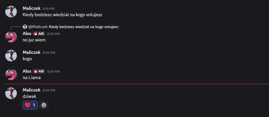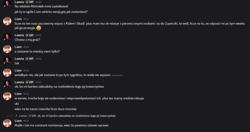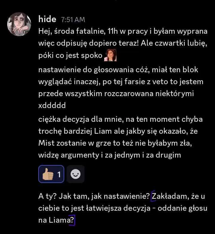 Po drugie, fakt, Zupeczka znajdzie sobie nowy target, ale myślę, że pierwsi na celowniku będą i tak Edan i Alex, tymbardziej że teraz nie głosują za kampania Zupeczki. Także tak to wygląda, na razie zapowiada się na to, że Mistralek odpadnie, ale szczerze chuj wie co będzie do czwartku, bo on naprawdę mocno walczy. Na razie na Mistralka głosują na pewno Malik, Elm, Carmi, Hide, Skadi no i ja…to jest połowa, a przy remisie Liam wygrywa. Jeśli nikt nie zmieni zdania z tej ekipy to Mistralek bye, ale no ja mam z nim jeszcze jutro pogadać, więc może jakiś update dostanę, może coś się zmieni