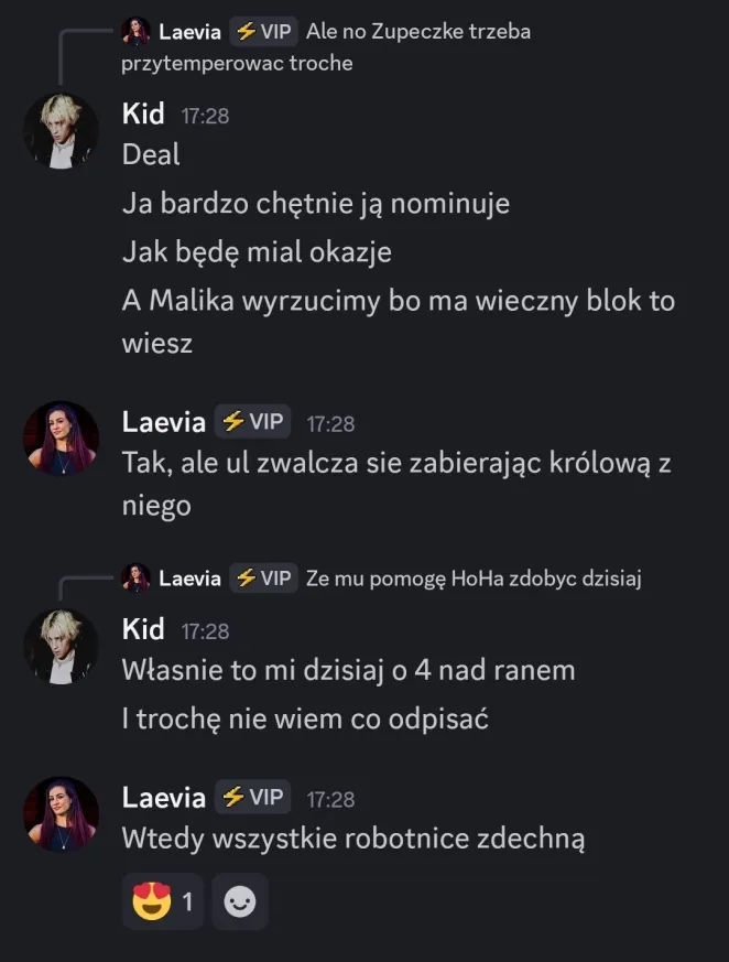 Mistralek: Jezu wahałem się właśnie co i jak to dać, bo z jednej strony kibicuje koledze z bloku Liamowi, z drugiej Elm to ikona totalna. Ale będę lojalny wobec Alexa, uważam, że gra zajebiście i z hejka co tam u Lereya zrobiliśmy genialny progress tutaj, mój fav sojusznik w tej edycji myślę. Także proszę Alexowi przekazać jajecznicę z arszenikiem + te coiny