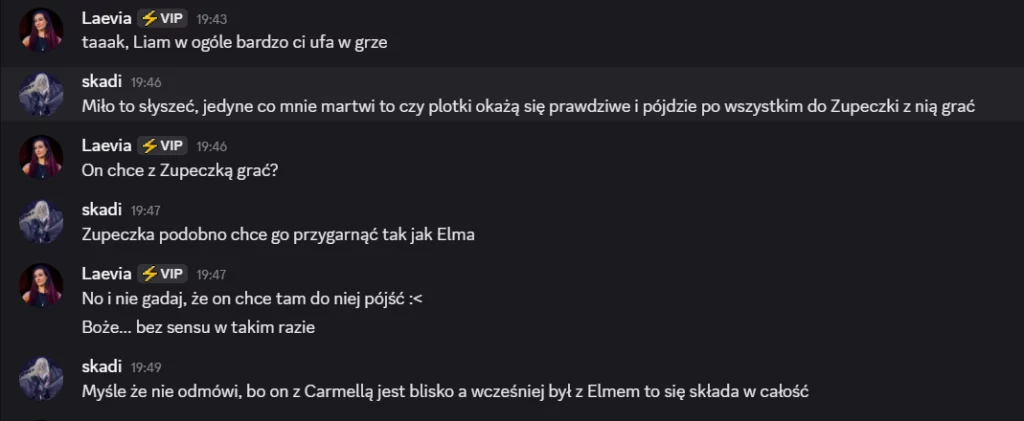 Trochę mnie bawi, że doszliśmy z Zupeczką do wniosku, że my ze sobą giga dużo piszemy, a i tak jest jak jest w grze XDD I mean rozumiem jej ruch, ale jak jej mówiłem – ona miała większe problemy niż moja osoba myślę i ciekawi mnie jak sobie poradzi po mojej eliminacji. Czy odpadnie w przeciągu dwóch tygodni czy da radę?