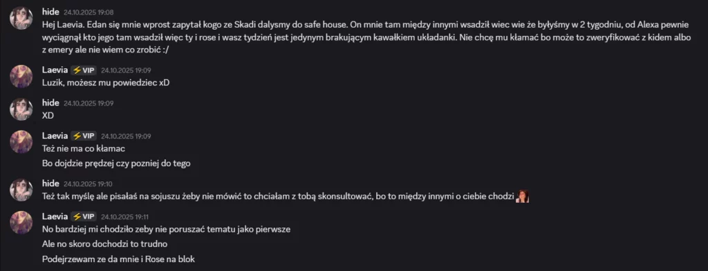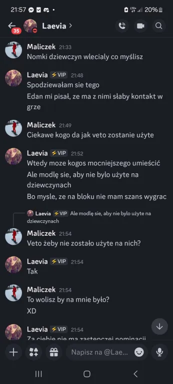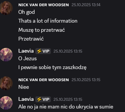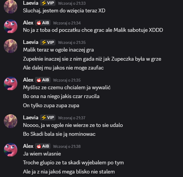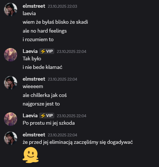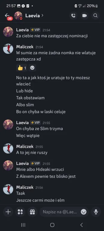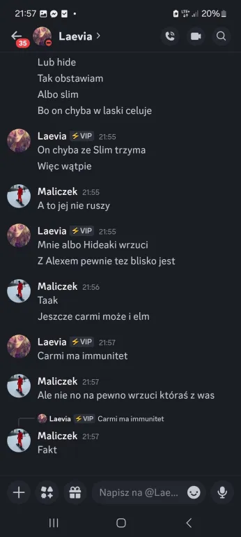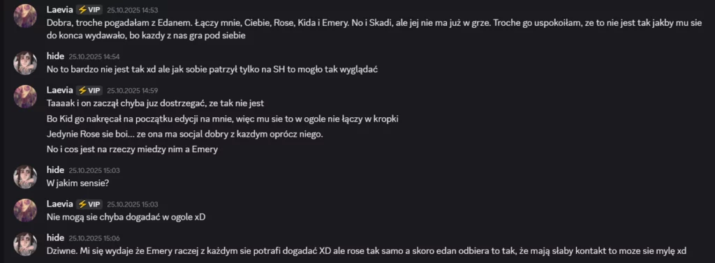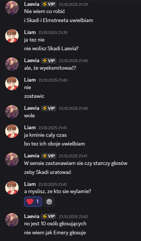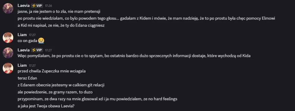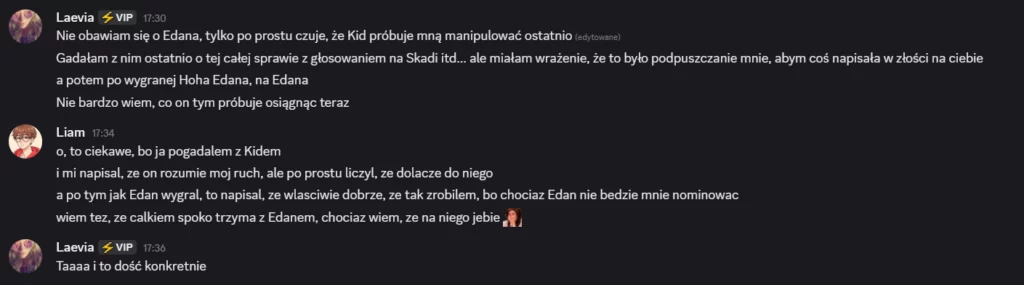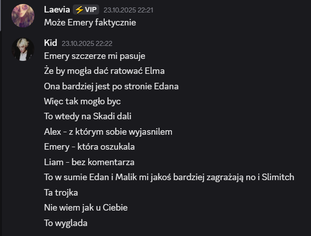 Także tak…odbyłem szczerą rozmowę z Liamem, on mi się przyznał, że usłyszał od Laevii, że na niego nagaduje. To była prawda, ale szczerze no kurde byłem w szoku, że Laevia to wygadała. Ja wybrnalem jakoś z sytuacji zwalilem to na emocje po tym jak Skadi odpadła, powiedziałem, że mu ufam i takie inne bzdety. Pozornie na Laevie muszę bardzo uważać, bo ona nawet z tym Liamem blisko nie jest a mu rozgaduje, więc no lipaa. Ogólnie chyba ta rozmowa wypadla całkiem nieźle? W sensie też widzę, że mu zależało na niej i to doceniam, ja go nie skreślam, umówiliśmy się, że będziemy po prostu bardziej otwarcie ze sobą gadać i szczerze ja to widzę. Popełniłem błąd osadzając go o grę z Edanem, może wolał po prostu zostawić Elma, to były emocje. Ale jeśli faktycznie on jest tylko za Elmem, a z Edanem jest neutralny to ja to zjebalem i w sumie warto byłoby to odratować, mam nadzieję, że uda mi się naprawić to co rozwaliłem boze czuje się jak syn marnotrawny