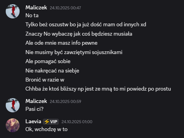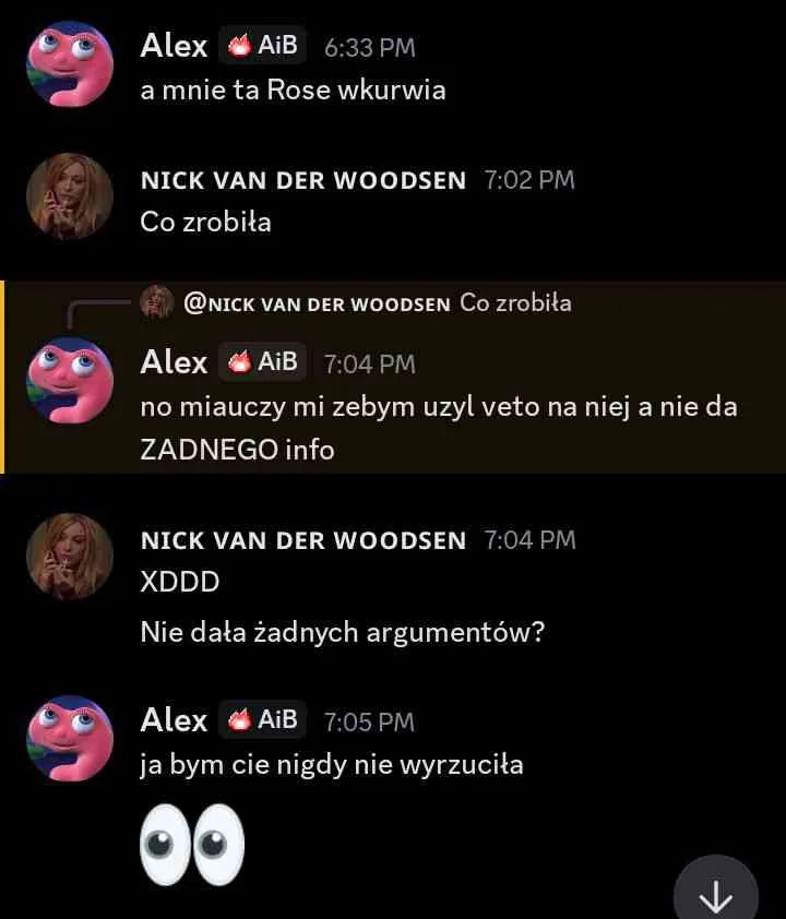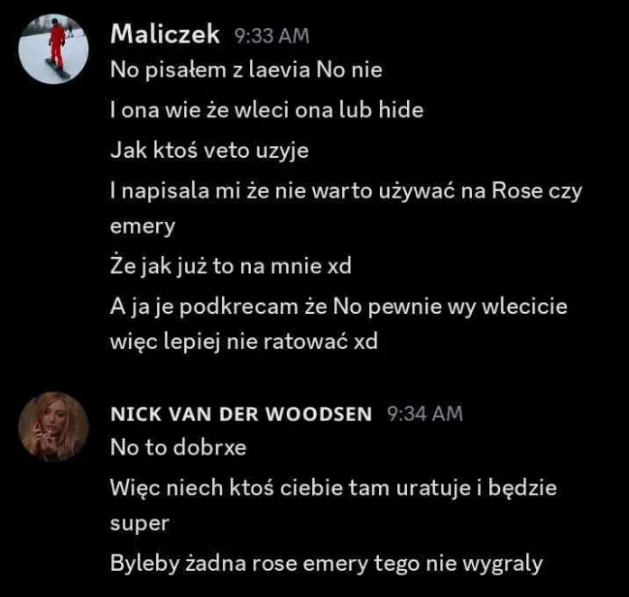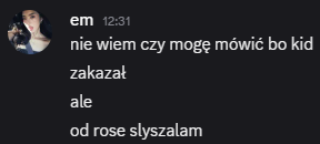 dodatkowo powiedzial, ze nie powie nic Laevii (i jeszcze rzucil, ze po naszej rozmowie nie wie na czym stoją 👀) i chyba faktycznie dorzuci sie glosem do Rose. :CatBlush: zatem dwie pieczenie na jednym ogniu – Kid i Laevia w miare sa spoko ze mna i jest szansa, ze miedzy soba im sie zacznie sypac + mamy kolejny glos na Rose. :CatBlush: