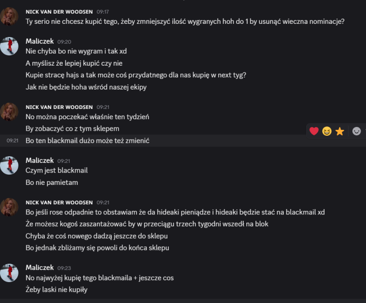 Słyszałem w ogóle, że Slimitch dzisiaj przyszła z jakimiś wątami do Rose, że czemu na nią nagadywala XDDDDDD i ja nie wiem szczerze skąd ona ma takie informacje, ale widzę, że tam grubo między nimi jest, więc jeśli Różyczka wygra veto to zgaduje, że Laevia może polecieć na zastępstwo może? Bo one są bardzo blisko siebie teraz Teraz szczerze to co chce zrobić co jako jedyne przychodzi mi do głowy podczas gdy stoje między tym młotem a kowadłem to umocnić sobie wtyki w tych pozostałych grupkach po prostu gadając bardziej poważnie, strategicznie, a nuż coś z tego wyciągnę. Pogadam przede wszystkim z tymi, do których mi jakoś najbliżej tzn. z Alexem i Carmellą, może nawet z Elmem, bo mimo tego, że na niego zagłosowałem to wkurwila go np Slim, więc może znajdziemy wspólny język. Nie poddaje się, będę szukał jakichś nowych ścieżek no i miejmy nadzieję, że nie zabladze czy coś xD
