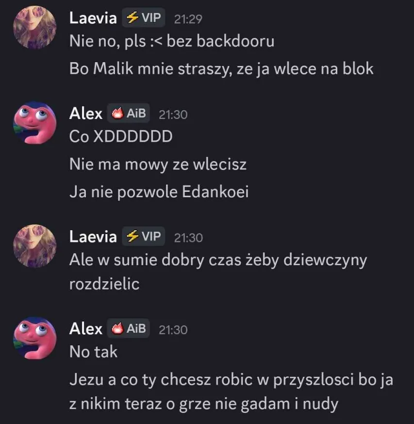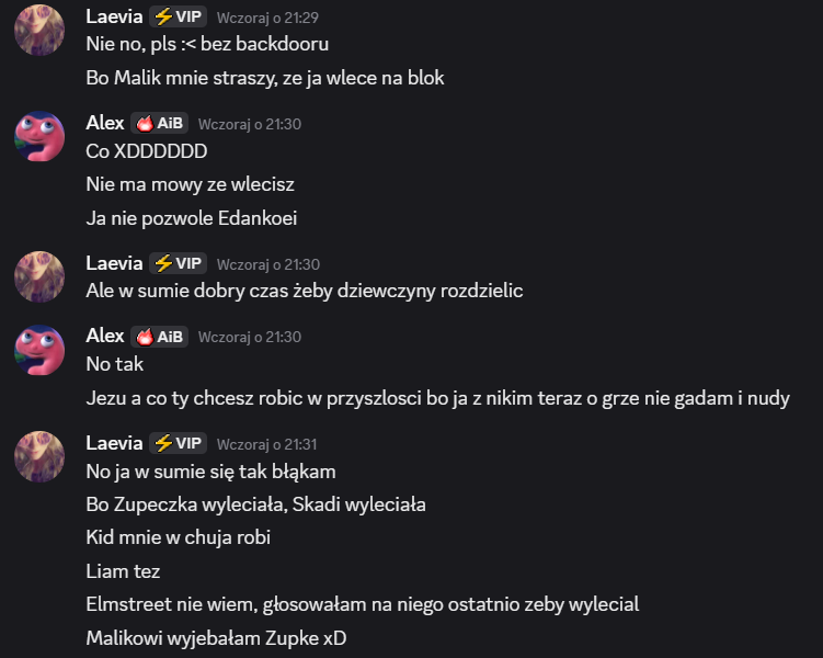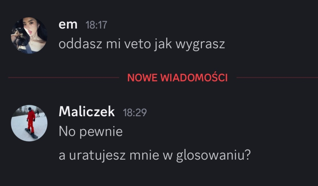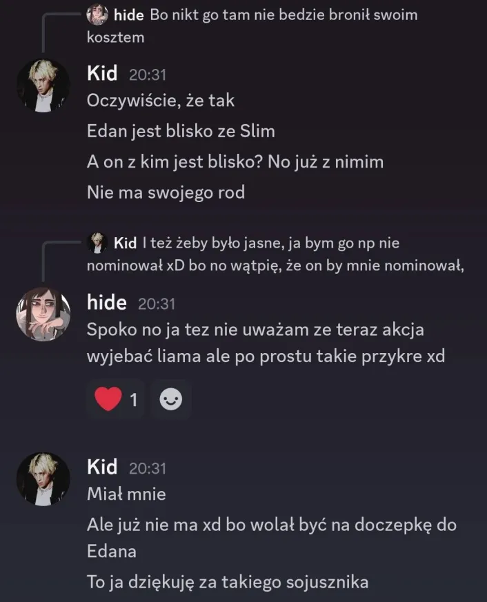 Od Kida dostałam jakieś rewelacje niby w sekrecie i nie wiem nawet jak to mam skomentować XD co za gość z tego Liama, z niego serio taka fest chorągiewka jest żeby Kid nawet tak o nim pisał? 😭 Każdy sobie tam gra jak chce, już wcześniej mówiłam że wyjebane na niego bo się zachowuje od kilku głosowań jak się zachowuje ale dziwnie się tak dowiadywać od Kida nawet, że ten już nie będzie z nim ride or die xd