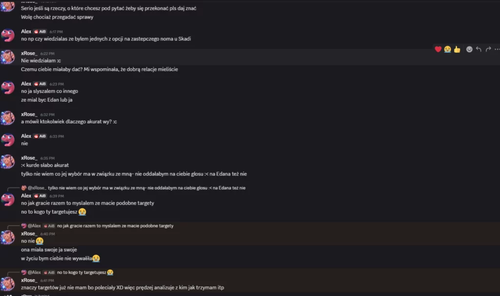 bylem w szoku jak Edan powiedzial mi, ze stoi spoko z Laevia. Laevia, ktora probowala targetowac Edana pare razy. XD tak samo dowiedzialem sie, ze Slim jest bardzo za Rose. za Rose, ktora mnie wypytywala o Slim czy nie wygaduje roznych rzeczy. dodatkowo Rose mi mowila, ze chce targetowac Slim, wiec skoro ja to od niej uslyszalem, to serio musiala byc zla. XD zatem chyba trzeba uswiadomic tych ludzi…