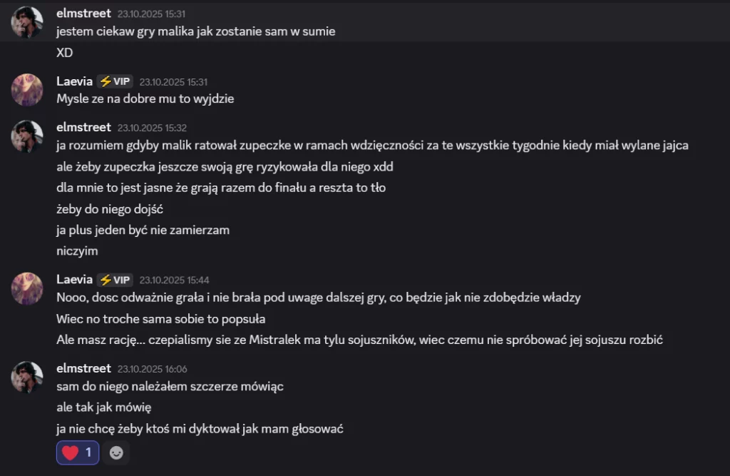 Czy jestem zaskoczona nominacjami? Ani trochę. Slim nominowała dwie osoby, z którymi de facto miała już na pieńku. Skadi niedawno ją nominowała, a Elmstreet publicznie wytaczał jej dramy dotyczące jej „nudnego” głosowania. Na tym etapie gry nie ma już bezpiecznych nominacji, każda decyzja niesie ze sobą ryzyko. Slim wybrała osoby, z którymi po prostu się nie dogadywała i nie widziała realnej szansy na wspólną grę.Uratowanie Malika zawsze jest dobrym ruchem, jeśli nie zależy komuś na tym, aby go wywalić z gry. Nie musiała podawać zastępczej nominacji, a głosy rozłożyły się między Elmstreetem, a Skadi. Po co miałaby sobie robić w kimś kolejnego wroga, kiedy mogła zaplusować u bezdomnego i bezpańskiego Malika?