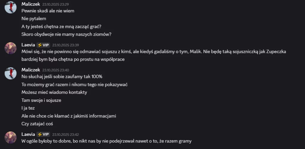 Tak, wiem. Wiele razy pisałam, że uwielbiam Zupeczkę i to się nie zmienia. Jest bardzo sympatyczną osobą. Ale w jej grze było coś, co nie pozwalało mi jej w pełni zaufać. Choć nie zrobiłam jeszcze nic spektakularnego w tej edycji, to połączenie dwóch szalonych bab mogłoby się skończyć źle. Ja potrzebuję przy sobie kogoś, kto potrafi mnie w razie czego sprowadzić na ziemię, a Zupeczka… cóż, ona raczej by mnie tylko podkręcała, żeby coś odwalić. W każdym razie będę miło wspominać nasza gry w papier-kamień-nożyce. To było dość zabawne… 😄 Tak samo, jak kiedy przechytrzyłyśmy Mećka, aby sobie dodał trójeczkę do nicku.
