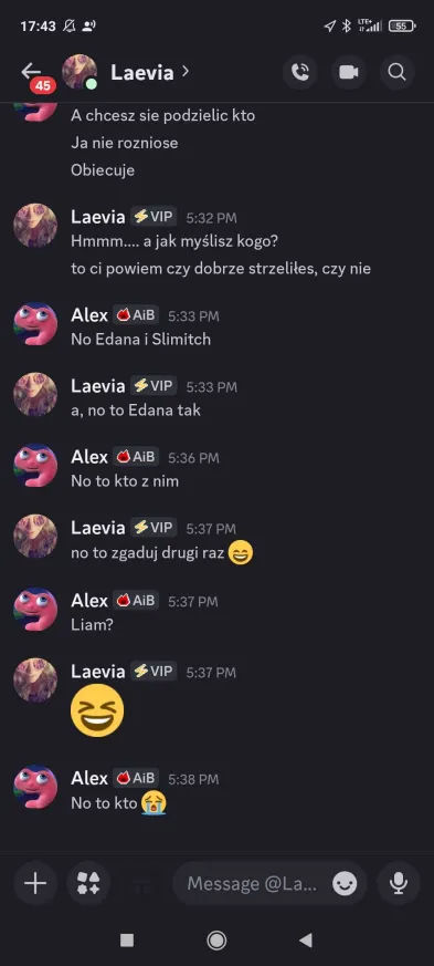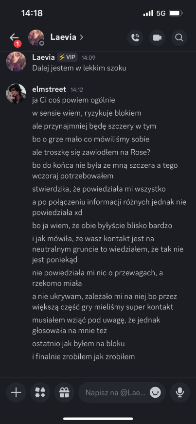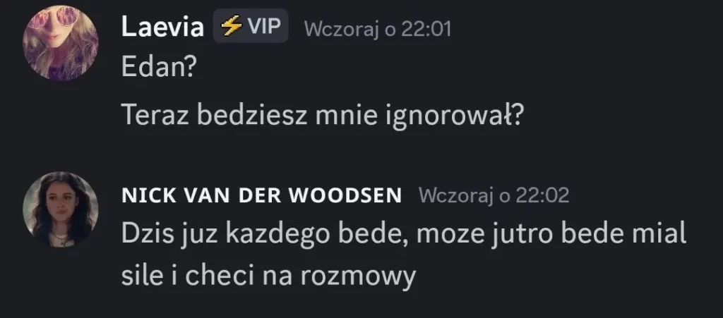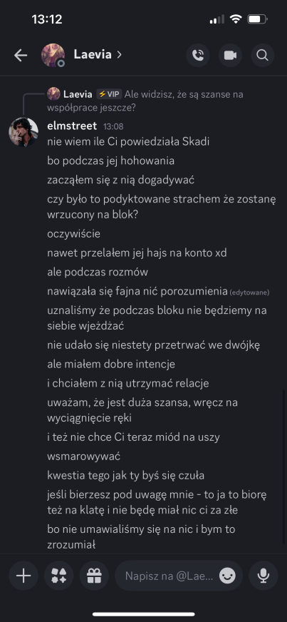 Laevia zdradziła mi, że Edan powiedział jej coś w stylu, „wiem że chcesz mnie wyjebac” i podobno napisał jej że wie to od Kida XDDDDDD oj Edan, Edan nieładniee. Na moje szczęście Laevia jest zdecydowanie po mojej stronie, więc na ten moment czuje się względnie bezpiecznie❤️