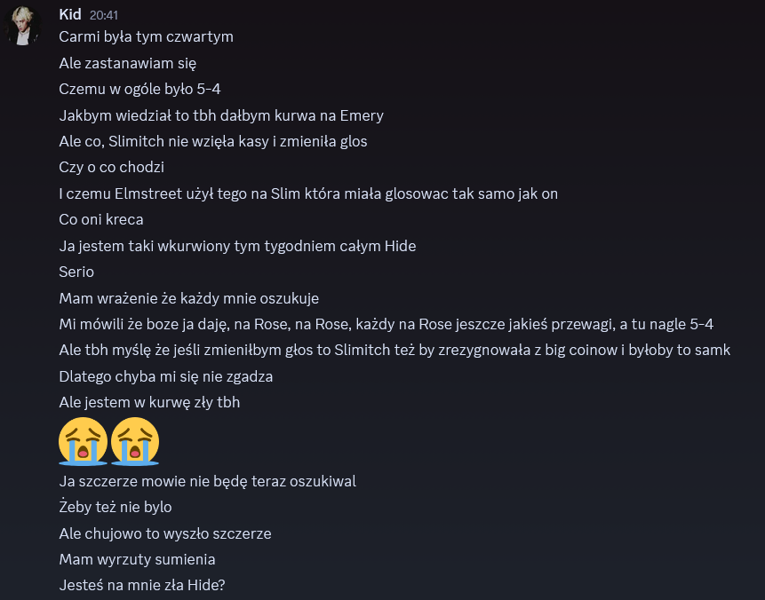 Zrobię retrospekcje tamtej konfy I napisze nowa Bo w sumie bym oszukał faktycznie Deleted data: Ogarnialem jak te głosy faktycznie poszły i wyszło mi, że Slimitch zagłosowała na Emery przez tą przewagę, więc wychodzi na to, że i Carmi i Malik zagłosowali na Rose, także była większość na Rose, nie muszę się już martwić, uff Update sytuacji, jednak nie zrozumialem jak działa ta przewaga chyba XDDD i jakieś strasznie pogmatwane to się okazało, ostatecznie po weryfikacji wydaje mi się, że jednak Malik zagłosował na Emery i wtedy wszystkie głosy by się zgadzały, Carmi na 90% została przy głosie na Rose Jeszcze raz serio przepraszam😔😔 Czyli ostatecznie głosy Na Rose: Kid, Liam, Alex, Elmstreet, na 90% Carmella Na Emery: Hideaki, Laevia, Slimitch, na 90% Malik
