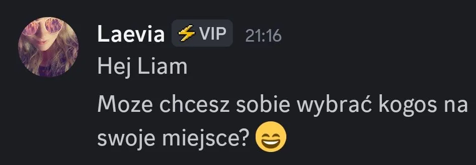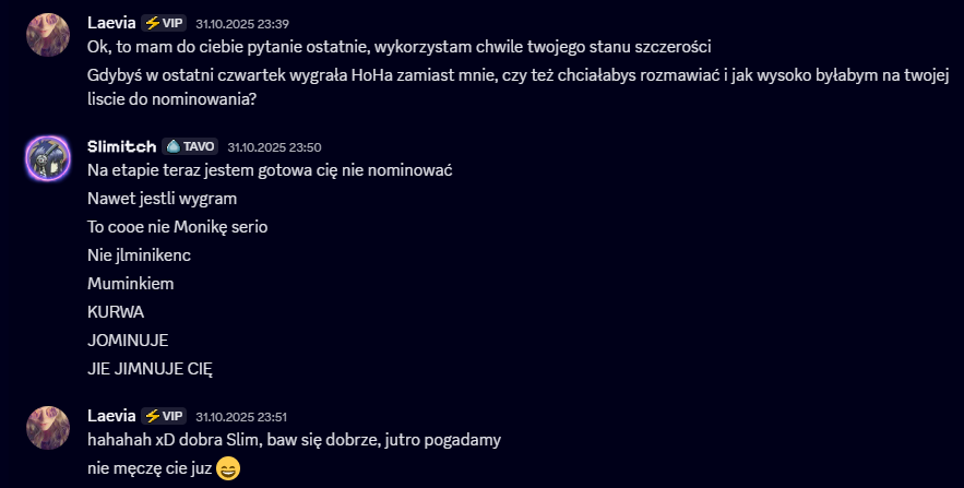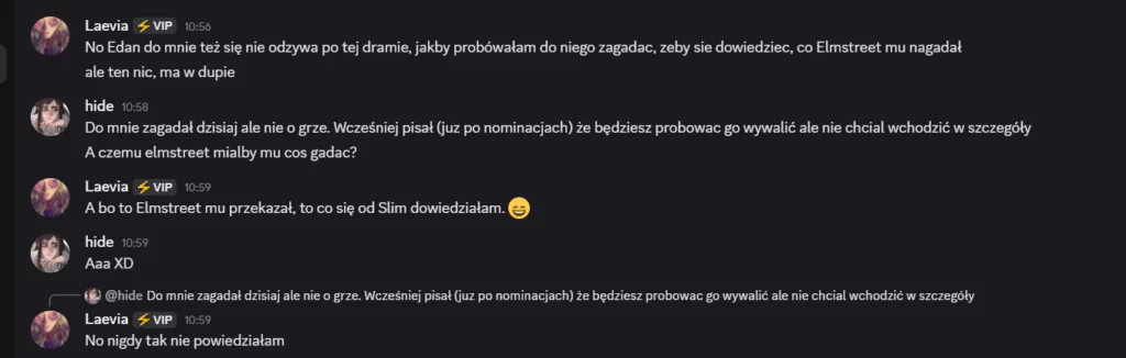Liam: dodać do Twoich propozycji @Kid. Kid, przepraszam, ale w ostatnim czasie mieliśmy parę rozbieżności. Pomimo tego, że przegadaliśmy poprzednie nominacje, to ostatnio podczas rozmowy… wydaje mi sie, ze pomyliles czaty i napisales do mnie wiadomosci, ktore byly dedykowane do innej osoby. wiadomosci, w ktorych przekazujesz informacje ode mnie (plus Twoj komentarz na ten temat…). wierze, ze Laevia i tak ma juz swoja decyzje podjeta, wiec mysle, ze mozesz spac spokojnie, ale chyba chcialem to nazwac. mega chetnie wroce do tego tematu, by to wyjasnic, ale na dzis taka jest moja decyzja.