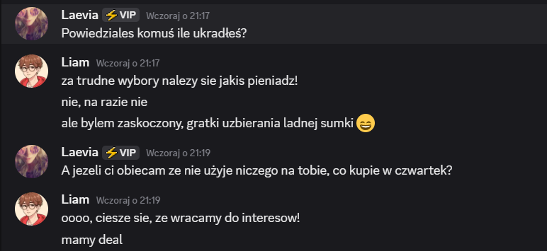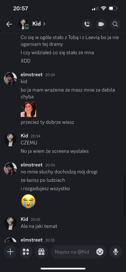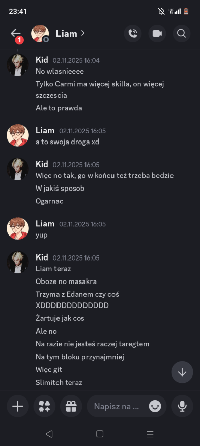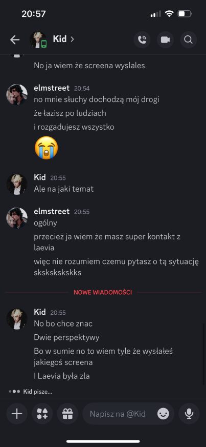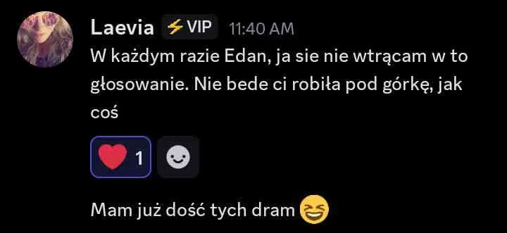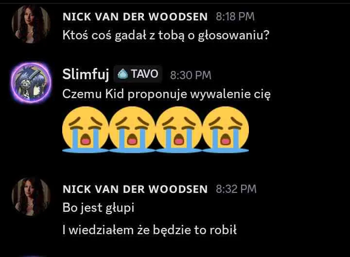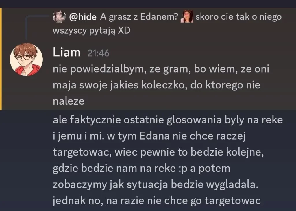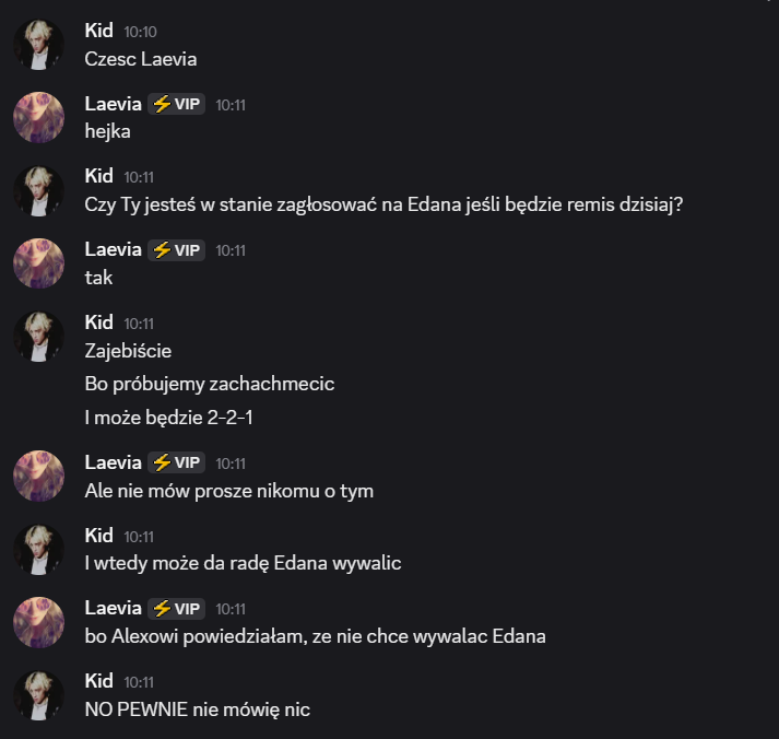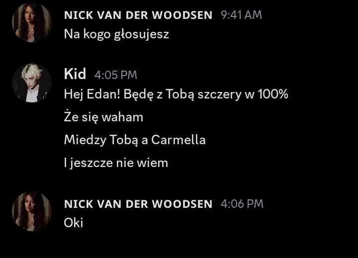 Liam: dodać do Twoich propozycji @Kid. Kid, przepraszam, ale w ostatnim czasie mieliśmy parę rozbieżności. Pomimo tego, że przegadaliśmy poprzednie nominacje, to ostatnio podczas rozmowy… wydaje mi sie, ze pomyliles czaty i napisales do mnie wiadomosci, ktore byly dedykowane do innej osoby. wiadomosci, w ktorych przekazujesz informacje ode mnie (plus Twoj komentarz na ten temat…). wierze, ze Laevia i tak ma juz swoja decyzje podjeta, wiec mysle, ze mozesz spac spokojnie, ale chyba chcialem to nazwac. mega chetnie wroce do tego tematu, by to wyjasnic, ale na dzis taka jest moja decyzja.