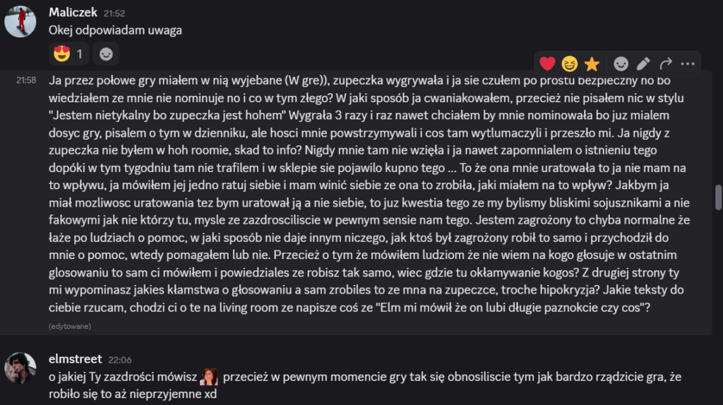 Alex: Jezu Dziekuje ❤️ ale no wchodząć do tej gry wiedziałem że chciałem grać mocno po srodku bez zauważenia z dobrym socjalem z każdym. Czy spodziewalem ze to sie uda oczywiscie ze nie ale jestem dumny z gry jaka gralem DO DZISIAJ OCZYWISCIE Jedyny blad jaki zrobilem to dałem emocja wziac góre i zrobiłem to co mi serce podpowiedzialo jak widac serce nie zawsze mądrze mowi